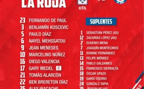 De esta forma, la Roja formará con Fernando de Paul en el arco; Paulo Díaz, Gary Medel y Benjamín Kuscevic; Nayel Mehssatou, Tomás Alarcón, Marcelino Núñez y Alex Ibacache; Diego Valencia, Ben Brereton y Jean Meneses.