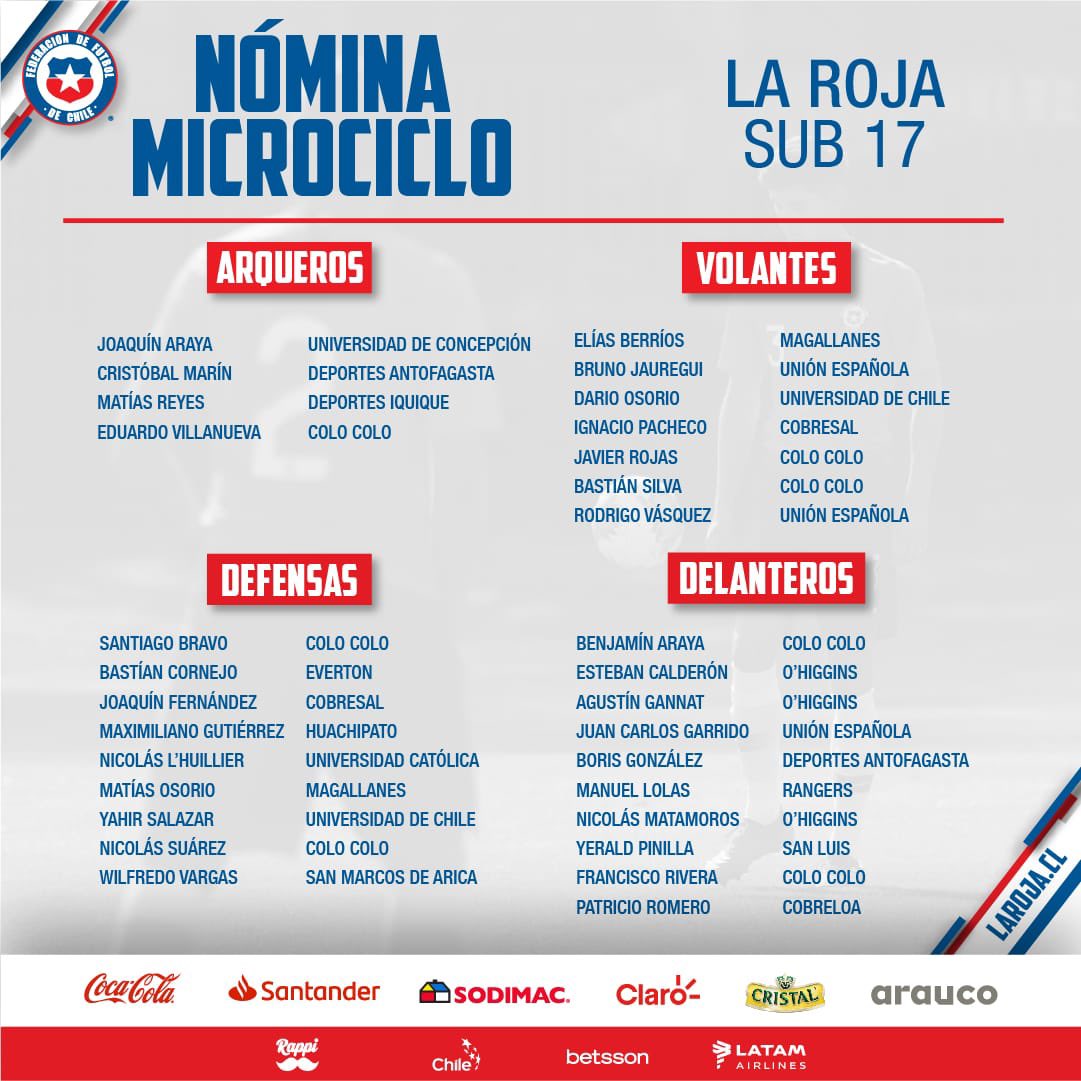 La selección chilena Sub 17 comenzará con los trabajos de microciclo en el Complejo Deportivo Quilín este lunes 20 de septiembre y el entrenador Hernán Caputto dio a conocer la lista de convocados donde destacan siete jugadores de Colo Colo.
