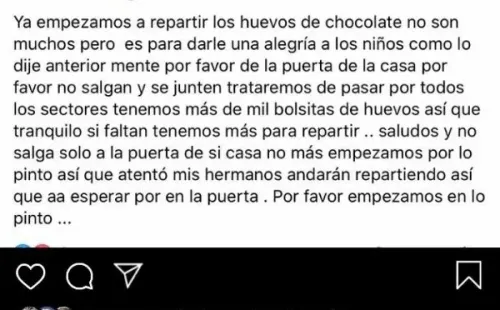 “Ya empezamos a repartir los huevos de chocolate no son muchos, pero es para darle una alegría a los niños como lo dije anteriormente. Por favor de la puerta de la casa, por favor no salgan y se junten. Trataremos de pasar por todos los sectores, tenemos más de mil bolsitas de huevos así que tranquilo si faltan tenemos más para repartir”, escribió a través de redes sociales.