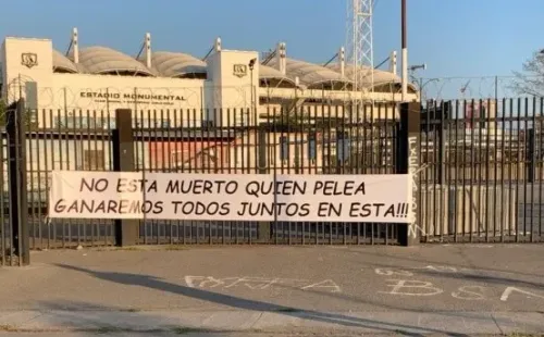 Esta tarde, en una de las rejas del Estadio Monumental apareció colgado un emotivo lienzo que decía: “No está muerto quien pelea. Ganaremos todos juntos en esta”.
