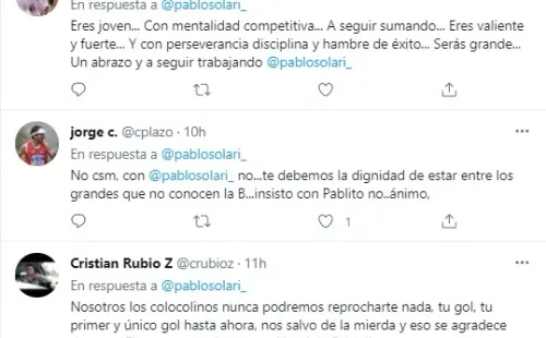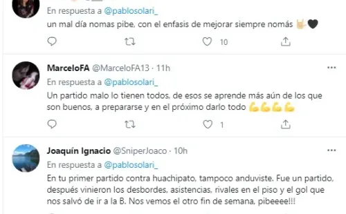 El atacante argentino publicó en su Twitter personal la palabra “resiliencia”, más un emoticón de una cabeza que explota. Tras esto los hinchas albos rápidamente se volcaron a favor de Solari, mandándole diferentes mensajes de aliento y afirmando que un mal partido lo puede tener cualquiera.