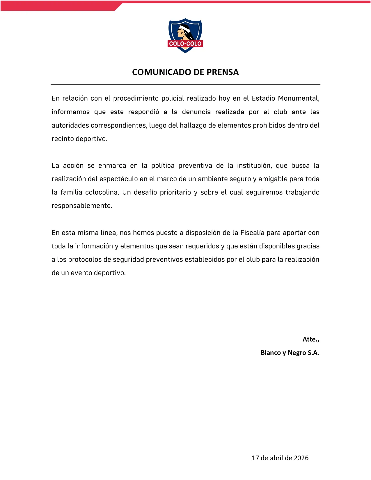 Para finalizar, comentaron que “en esta misma línea, nos hemos puesto a disposición de la Fiscalía para aportar con toda la información y elementos que sean requeridos y que están disponibles gracias a los protocolos de seguridad preventivos establecidos por el club para la realización de un evento deportivo”.