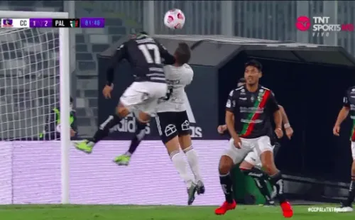 El peruano saltó a disputar el balón con Cristián Suárez, pero el defensor de Palestino le propinó un salvaje codazo al delantero Albo. Momento en donde saltó toda la banca y la mitad de Chile para reclamar un clarísimo penal.