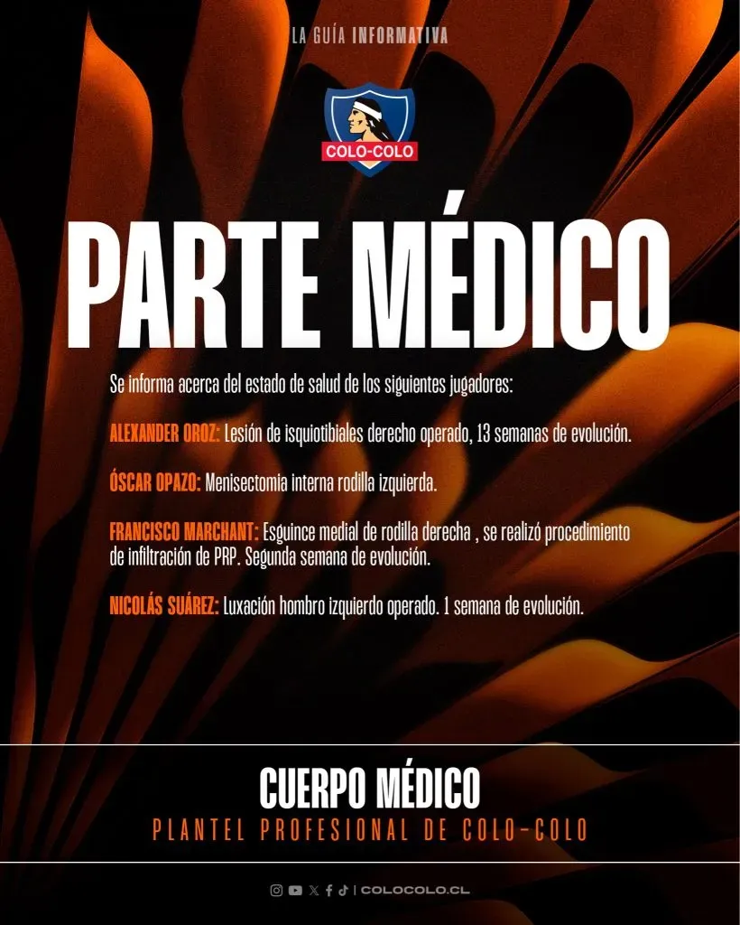 - Francisco Marchant: Esguince medial de rodilla derecha, se realizó procedimiento de infiltración de Plasta Rico en Plaquetas (PRP). Segunda semana de evolución.