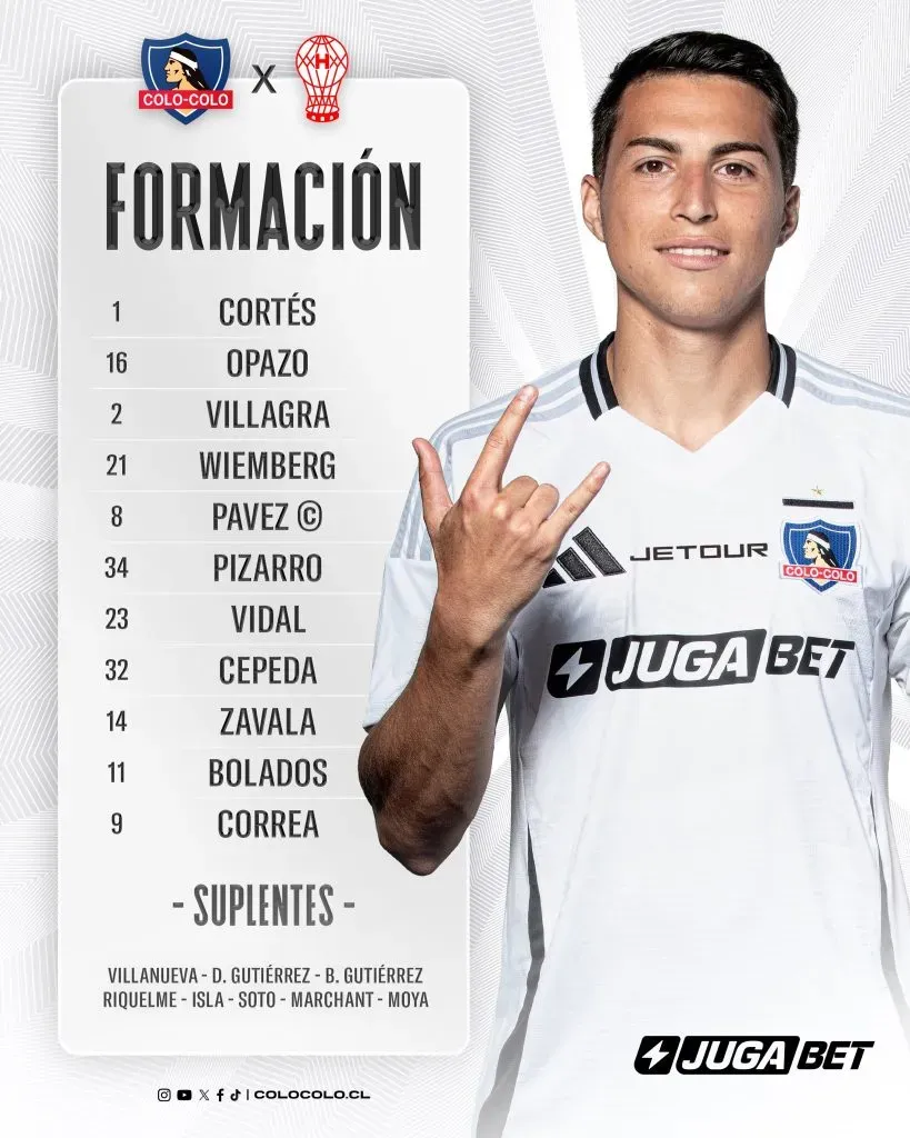Para superar al conjunto de Parque Patricios, el DT de Colo Colo confirmó la siguiente formación titular: Brayan Cortés en el arco; Óscar Opazo, Jonathan Villagra y Erick Wiemberg en defensa; Cristián Zavala, Esteban Pavez, Vicente Pizarro, Arturo Vidal y Lucas Cepeda en el mediocampo; Marcos Bolados y Javier Correa en delantera.