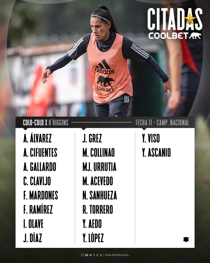 A ella, también se suman las figuras del plantel como Isidora Olave, Paloma López, Yanara Aedo, Ysaura Viso y Javiera Grez. Las colocolinas buscarán conseguir un nuevo triunfo para la escuadra de las Eternas Campeonas y seguir sumando confianza.