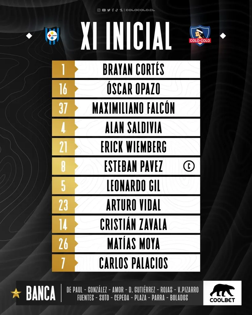 Así, la formación de Colo Colo estará compuesta por Brayan Cortés en portería; Óscar Opazo, Maximiliano Falcón, Alan Saldivia y Erick Wiemberg en defensa; Esteban Pavez, Arturo Vidal y Leonardo Gil en el medio del campo; Cristián Zavala, Carlos Palacios y Matías Moya en ofensiva.