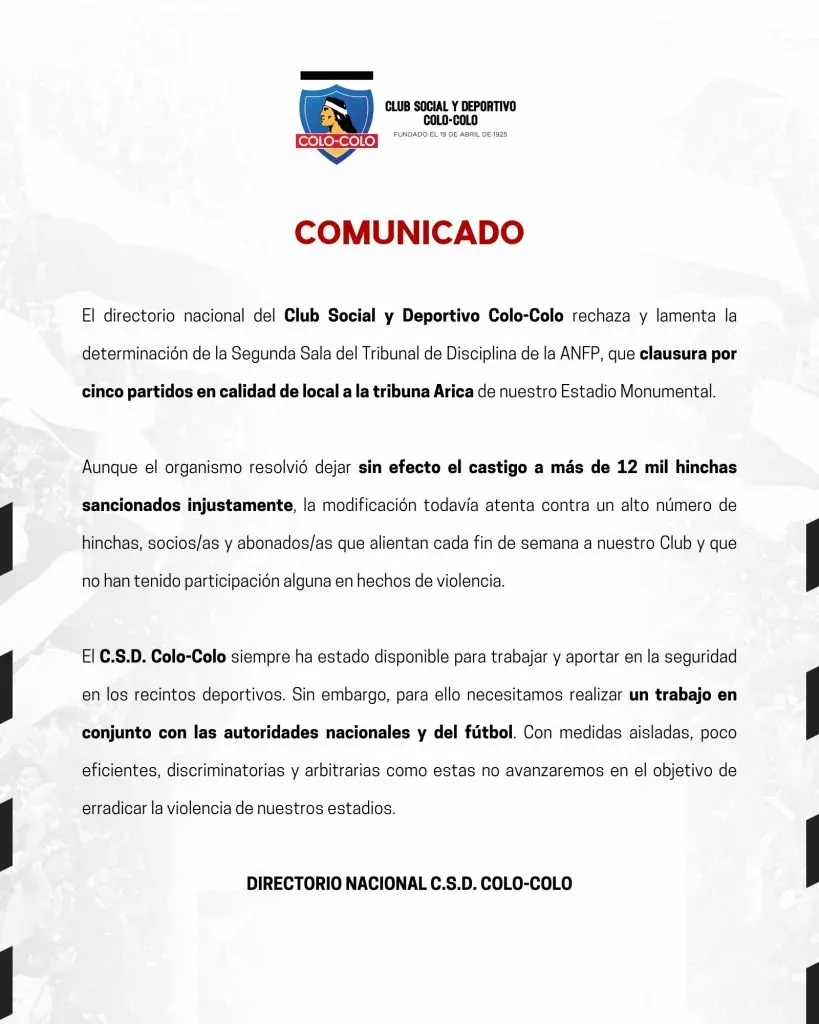 Ante esto, desde el CSD Colo Colo decidieron pronunciarse y criticar tanto la medida como a las autoridades competentes. Junto con rechazar la determinación y valorar que se dejara sin efecto el primer castigo, agregaron que “la modificación todavía atenta contra un alto número de hinchas, socios/as, abonados/as que alientan cada fin de semana a nuestro Club y que no han tenido participación alguna en hechos de violencia”.