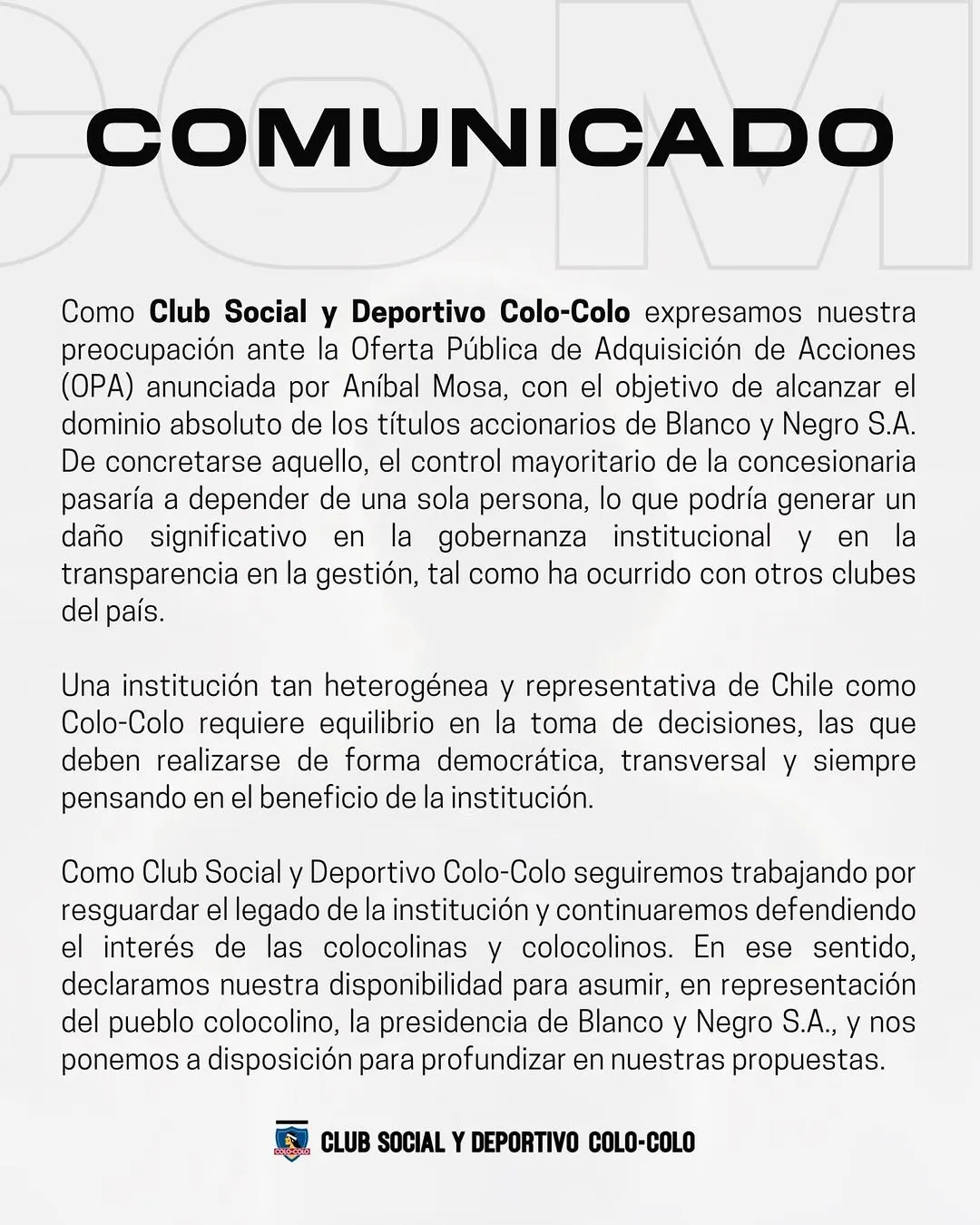 El escenario dirigencial en Colo Colo suma un nuevo capítulo. A través de un comunicado oficial, el Club Social y Deportivo manifestó su profunda preocupación ante la Oferta Pública de Adquisición de Acciones (OPA) anunciada por Aníbal Mosa, movimiento que podría cambiar radicalmente la estructura de poder en Blanco y Negro.