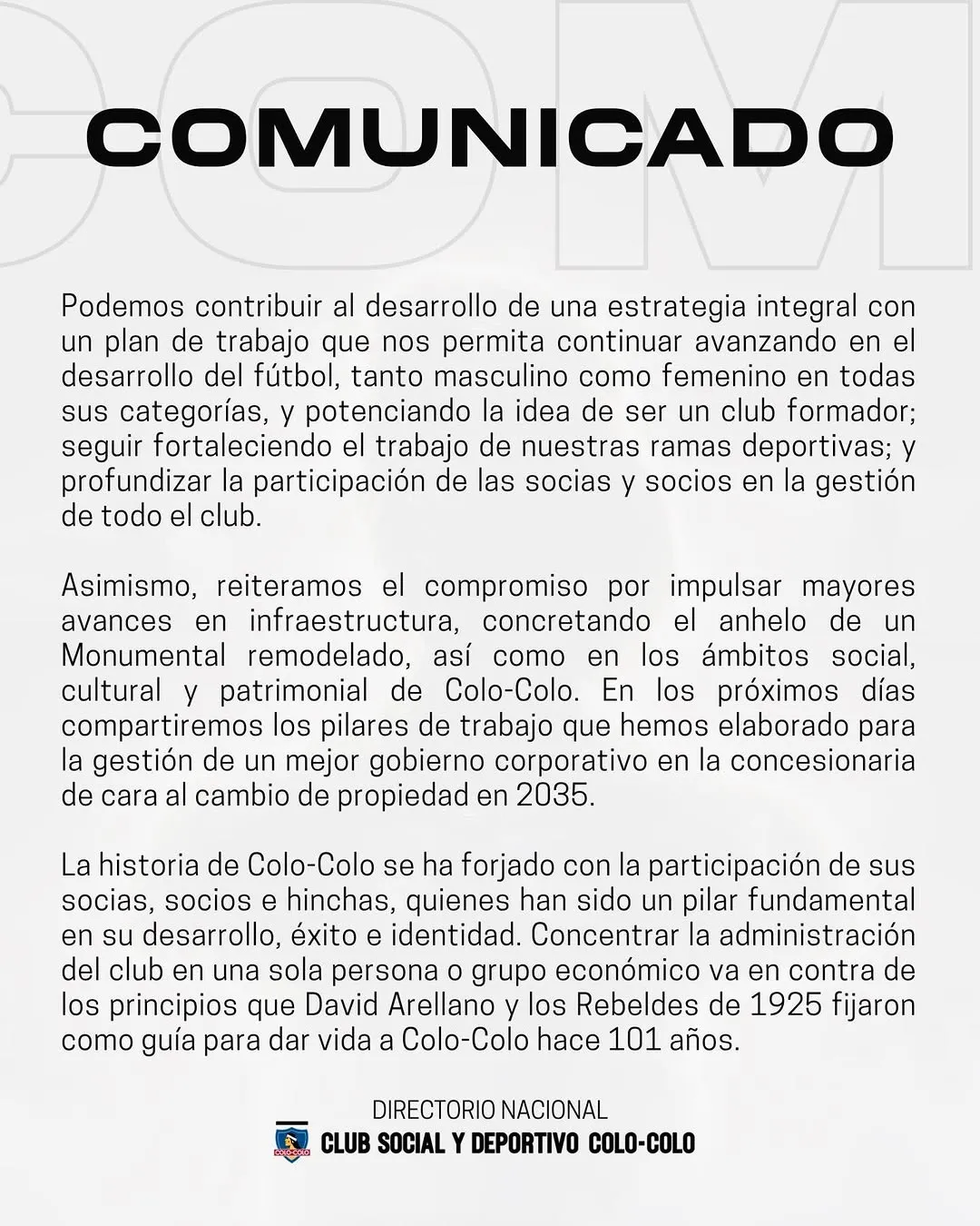 “Podría generar un daño significativo en la gobernanza institucional y en la transparencia en la gestión, tal como ha ocurrido con otros clubes del país”, indicaron en un comunicado lanzado por sus redes sociales. Además, recalcaron que Colo Colo, por su historia y representatividad, necesita mantener un equilibrio en la toma de decisiones, el cual debe sostenerse en principios democráticos y transversales, siempre enfocados en el beneficio del club.