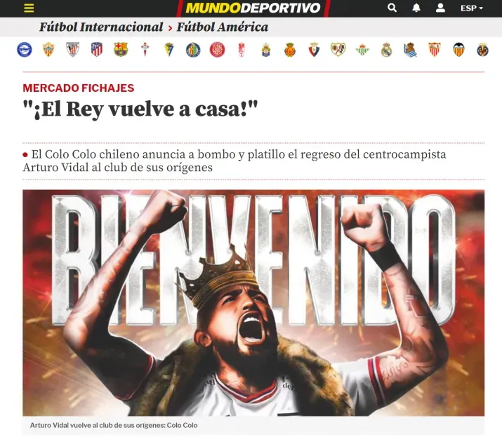 Desde Italia, Brasil y Argentina le dedicaron notas al retorno de Vidal. El prestigioso La Gazzetta dello Sport, tituló con “Vidal, ex de la Juve fichado por el Colo Colo: “El rey vuelve a casa”. En tanto que en su desarrollo detalló la importante carrera del King.