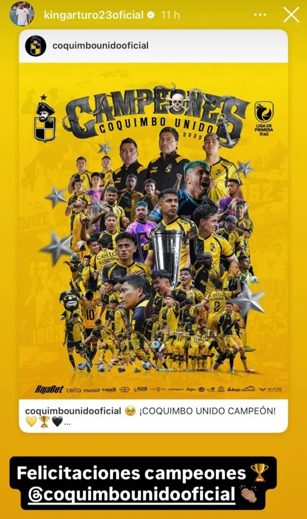 El King aprovechó su fin de semana sin ver acción producto de una contractura en el isquiotibial derecho para no despegarse de la TV para ver fútbol y cómo, ver la definición del certamen local que coronó a los coquimbanos. Y luego del pleito, el volante soltó un: “Felicitaciones, campeones”, acompañado de un aplauso.