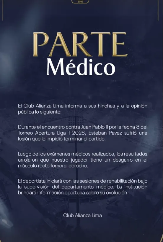 Pero el diagnostico entregado por su club fue otro. Alianza Lima confirmó que “tiene un desgarro en el músculo recto femoral derecho. Esteban Pavez iniciará con las sesiones de rehabilitación bajo la supervisión del departamento médico. La institución brindará información oportuna sobre su evolución”.