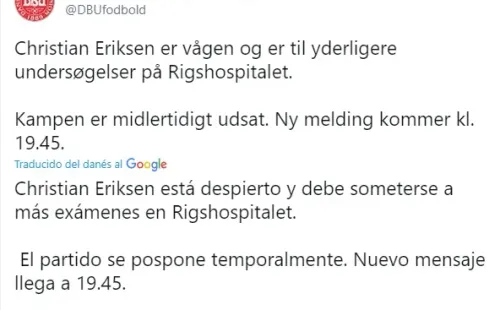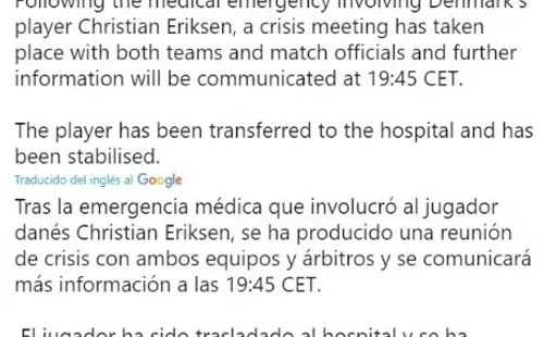 Afortunadamente la información que llega es favorable, ya que la UEFA confirmó en sus redes sociales que “el jugador ha sido trasladado al hospital y se ha estabilizado”, mientras que la selección danesa publicó que “Christian Eriksen está despierto y debe someterse a más exámenes en Rigshospitalet”.