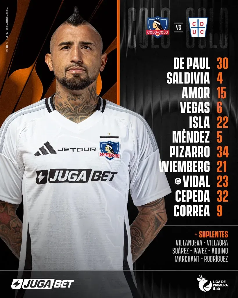 De esta manera, la formación de Colo Colo será con Fernando de Paul en el arco; Alan Saldivia, Emiliano Amor y Sebastián Vegas en defensa; Mauricio Isla, Víctor Felipe Méndez, Vicente Pizarro, Arturo Vidal y Erick Wiemberg en el medio del campo; Lucas Cepeda y Javier Correa en delantera.