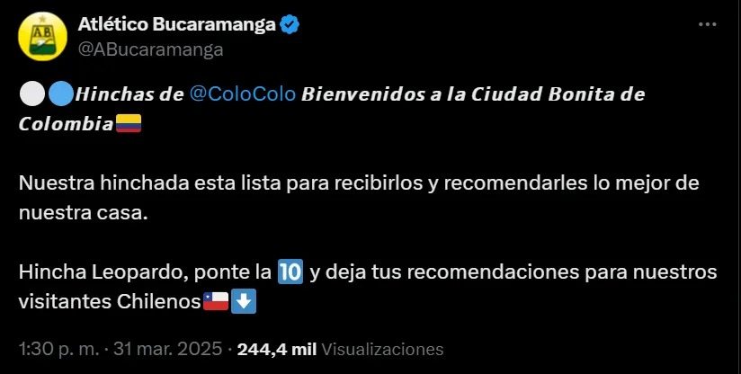 En sus redes sociales, el club “Leopardo” intentó ayudar lo más posible a los hinchas albos, ya sea con indicaciones sobre la venta de entradas como con los accesos para el partido de esta noche. Incluso, incentivaron a los bumangueses a recomendarles lugares y comidas típicas de la ciudad a los chilenos que viajan para el partido de la Copa Libertadores de América.