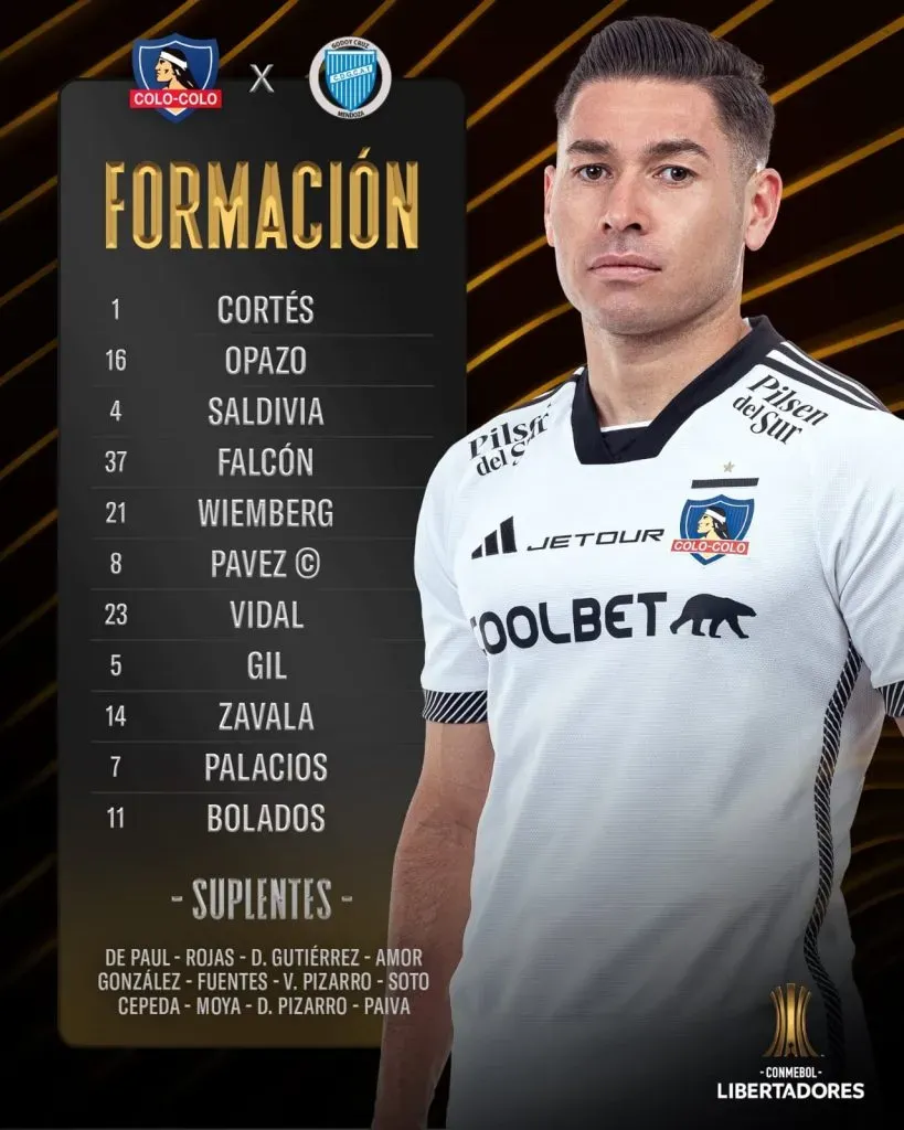 Hace instantes y a través de sus redes sociales el club Albo confirmó la oncena que buscará cerrar la clasificación a la siguiente ronda. Así, la formación del elenco colocolino será con Brayan Cortés en portería, Óscar Opazo, Alan Saldivia, Maximiliano Falcón, y Erick Wiemberg en el sector defensivo; Esteban Pavez, Arturo Vidal y Leonardo Gil en el medio terreno; Cristián Zavala, Carlos Palacios y Marcos Bolados en ataque.