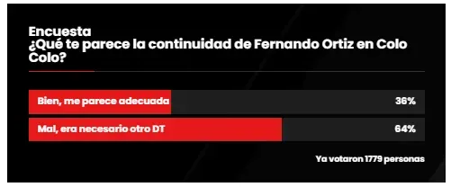 Según las estadísticas que entrega nuestra encuesta, el 64% de quienes respondieron reprobaron la aprobación de la directiva de mantener a Fernando Ortiz en la banca alba. Por contraparte, el 36% de quienes participaron se mostraron a favor.