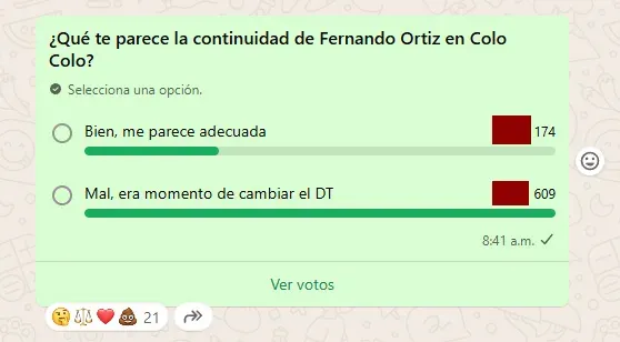 Mientras que en nuestro canal de Whatsapp, también se mantenía la tendencia de nuestra web. Más de 783 personas participaron donde la opción “mal, era momento de cambiar el DT” se impuso con el 77% de los votos (610), mientras que la opción “bien, me parece adecuado” obtuvo el 23% restante (174).