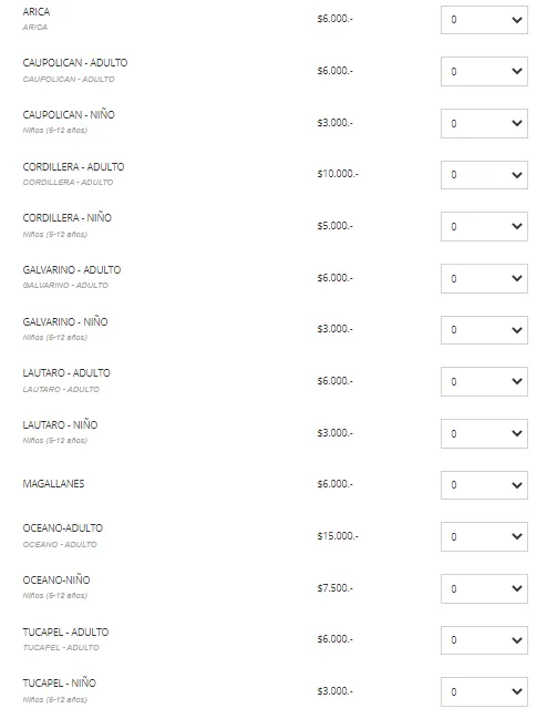 Los precios van desde los 6000 en el sector Arica hasta los 35 mil en el sector Rapa Nui. Por otro lado los codos también se encuentran a 6000, mientras que Cordillera y Oceáno están a 10000 y 15000 respectivamente.