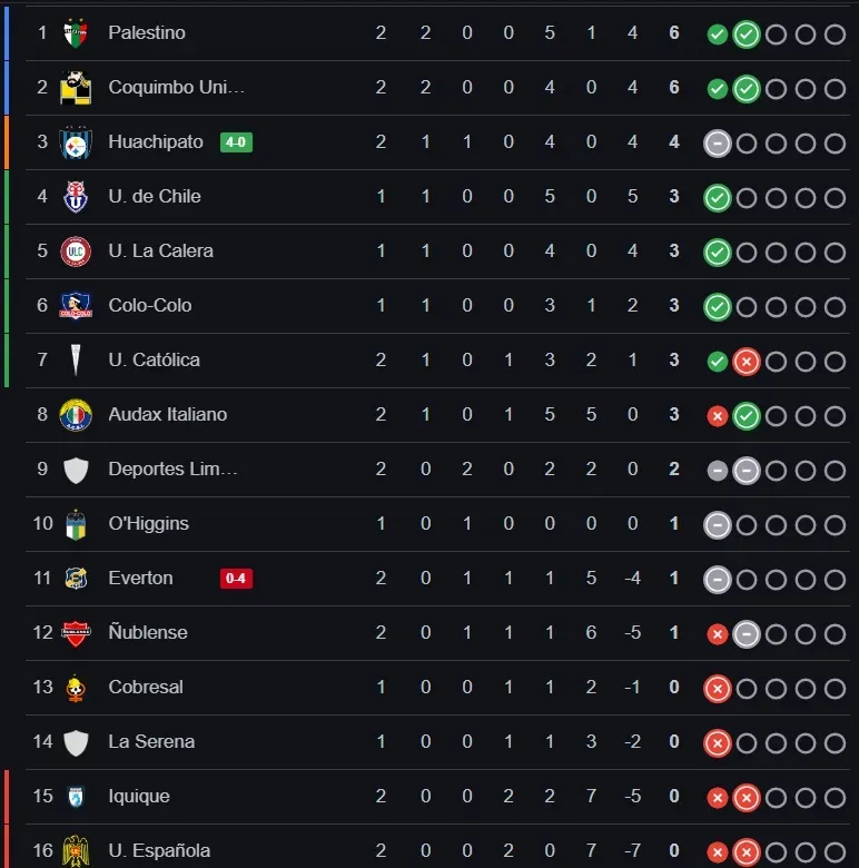 En el otro duelo, Audax Italiano venció por 4-2 a Deportes Iquique en La Florida, aprovechando que los Dragones Celestes tienen que viajar a Colombia para la vuelta de la fase 2 de la Copa Libertadores. Michael Fuentes (2′), Esteban Matus (35′), Luis Riveros (54′) y un autogol de Daniel Castillo (70′) fueron los tantos para los Tanos, mientras que los iquiqueños, colistas junto a Unión Española, descontaron gracias a Enzo Hoyos (72′) y Álvaro Ramos (79′).