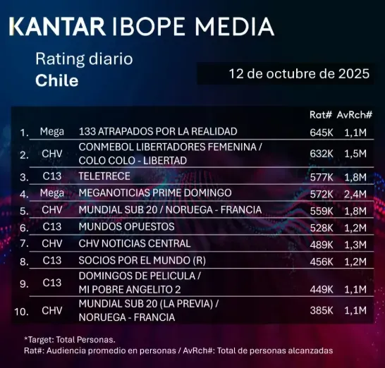 El encuentro dejó grandes números de rating para Chilevisión: según la medición oficial de Kantar Ibope Media, el partido fue visto en la señal abierta de CHV por más de 632 mil personas, y con un alcance de más de un millón y medio de espectadores. Ocupó ese domingo 12 de octubre el segundo lugar entre lo más visto de la TV abierta en sus señales por aire, solo por detrás de un programa de Mega.