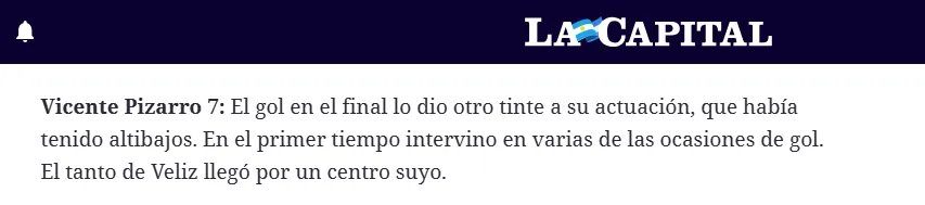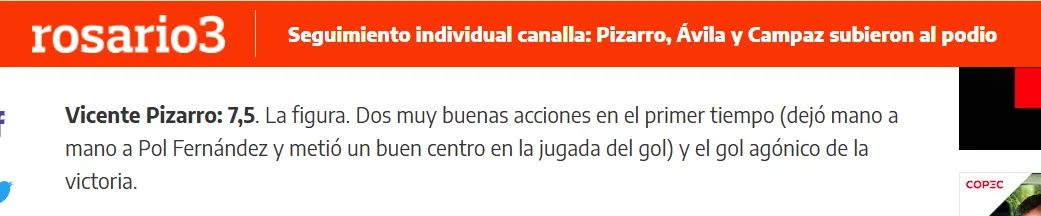 Por otro lado, La Capital tituló de esta manera su análisis individual. “Pizarro, el hombre que generó que el Gigante estallara por una victoria merecida”, escribieron y con una nota 7 al rendimiento del formado en el Monumental. “El gol en el final lo dio otro tinte a su actuación, que había tenido altibajos. En el primer tiempo intervino en varias de las ocasiones de gol. El tanto de Veliz llegó por un centro suyo”, agregaron.