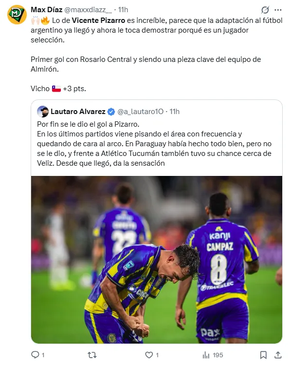 “Que bien por el Vicho Pizarro, primer gol en Rosario Central en fútbol argentino”, comentó otro usuario. “Esos goles ya se les echa de menos pero feliz que anotó su primer gol con Rosario“, expresó otro usuario que compartió la jugada.