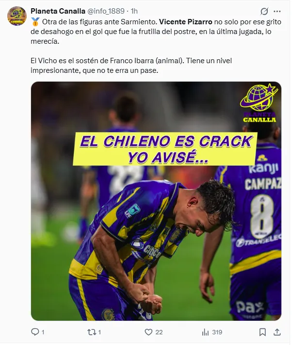 Mientras que los hinchas también festejaron con el chileno. “El Vicho es el sostén de Franco Ibarra (animal). Tiene un nivel impresionante, que no te erra un pase“, expresó una cuenta del Canalla en X. “A mucha gente no le gusta pero, partidazo de Vicente Pizarro, autor del segundo gol canalla”, dijo otro usuario de dicha red social.