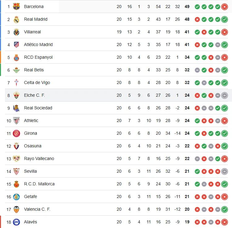 Además que se da una situación muy particular, porque el conjunto español está a cinco puntos de la zona de descenso directo, que la comparten Alavés (19 unidades), Levante (14 puntos) y Real Oviedo (13 positivos). Por lo que la lucha en la parte media baja de la tabla será de vida o muerte.
